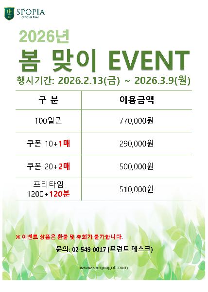 2026년 봄맞이 이벤트 페이지 정보 작성자 청담스포피아 작성일 2026-02-12 21:41:09 조회177회 첨부파일 관련링크 다음글 목록 /* 1. 댓글 비밀글 2. 댓글 captcha 3. 댓글 페이징 */ ?> 댓글목록 등록된 댓글이 없습니다. 이름 필수 내용 자동등록방지 7 + 3 = 다음글 목록